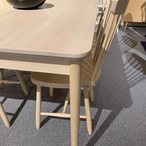 Haga pinnstol och Florida matbord 140cm i massiv lackad björk från småländska Wigells. Haga/ Florida är en svensktillverkad matgrupp i en smäcker och stilren design.