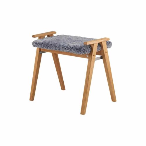 Alme pall i oljad ek/ fårskinn ljusgrå från Oscarssons Möbel. Alme är en svensktillverkad liten nätt pall. En fin detalj är handtagen på sidorna. En perfekt hallmöbel att sitta på när du knyter skorna!