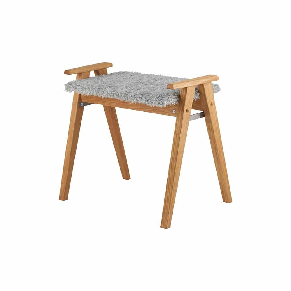 Alme pall i oljad ek/ fårskinnslook ljusgrå från Oscarssons Möbel. Alme är en svensktillverkad liten nätt pall. En fin detalj är handtagen på sidorna. En perfekt hallmöbel att sitta på när du knyter skorna!