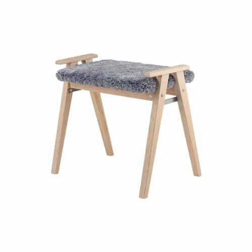 Alme pall i vitpigmenterad ek/ fårskinn ljusgrå från Oscarssons Möbel. Alme är en svensktillverkad liten nätt pall. En fin detalj är handtagen på sidorna. En perfekt hallmöbel att sitta på när du knyter skorna!
