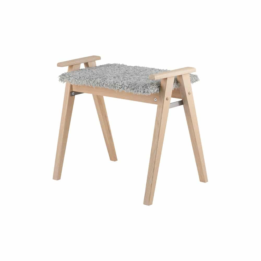 Alme pall i vitpigmenterad ek/ fårskinnslook ljusgrå från Oscarssons Möbel. Alme är en svensktillverkad liten nätt pall. En fin detalj är handtagen på sidorna. En perfekt hallmöbel att sitta på när du knyter skorna!