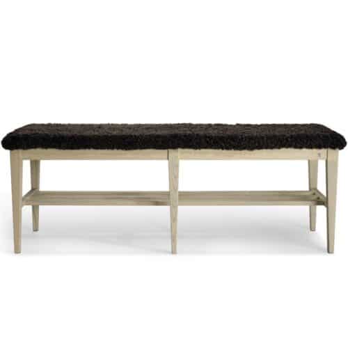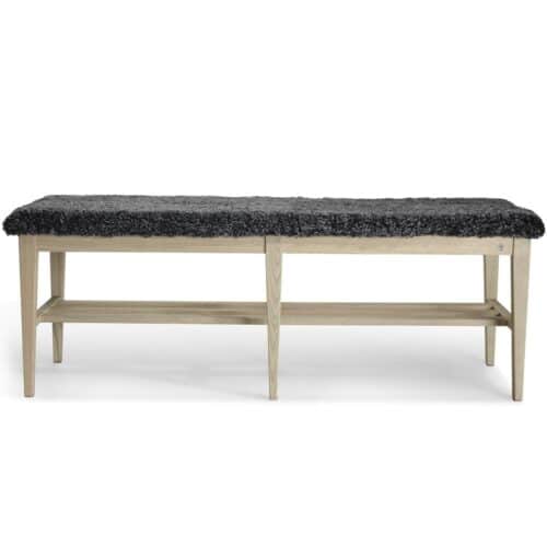 Nadja bänk i massiv gråoljad ask och äkta fårskinn. En svensktillverkad kvalitetsmöbel från småländska Oscarssons.