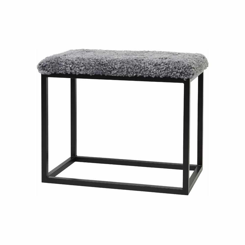 Palle mellan pall i fårskinn Charcoal Grey Silver 27 och underrede i svart stål. En nätt pall från Skinnwille som passar perfekt för hallen eller sovrummet.