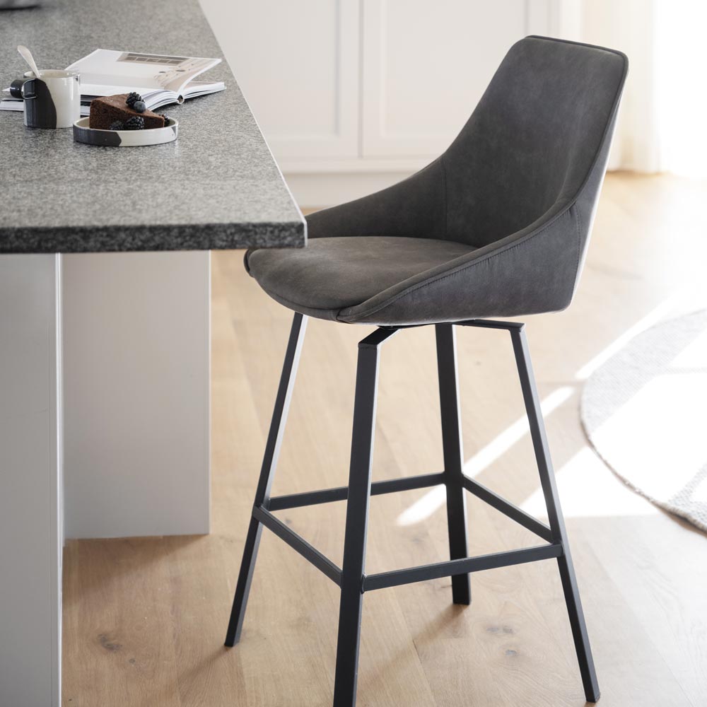 Alison barstol i grått microfibertyg och underrede med snurrfunktion i svartlackad metall från Rowico.