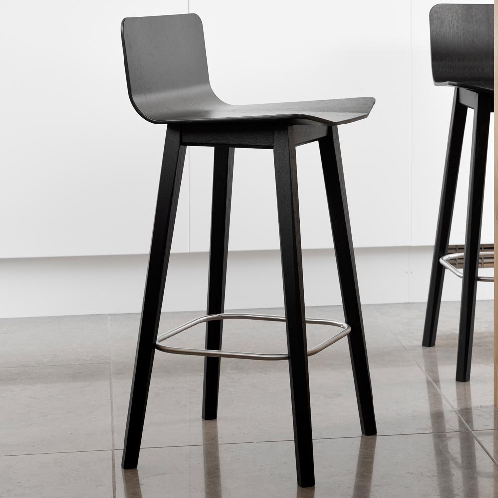 SM808 barstol i svartbetsad ek från danska Skovby. SM808 barstol är tillverkad i Skovbys egendesignade skalsits i formpressat och fanérat trä. Ben i massivträ med en snygg metallring innanför som ger stabilitet och fotstöd.