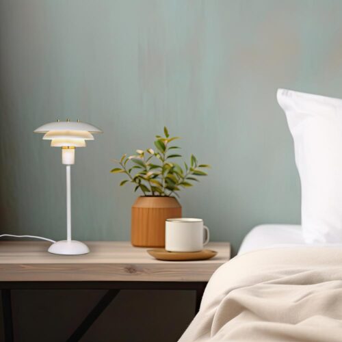 Bordslampan Epsilon har en klassisk design med tre sammansatta skärmar i mattlackad vit metall som fördelar ljuset på ett fint sätt och motverkar bländning. Med Epsilon medföljer dubbla uppsättningar dekorringar och knoppar, välj mellan krom eller matt mässing beroende på vad som passar bäst i just ditt hem.