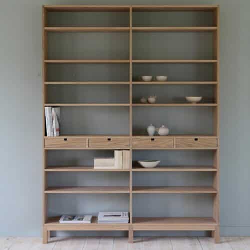 Högklint bokhylla i massiv oljad ek från gotländska G.A.D. Bygg Er egen bokhylla efter tycke och smak. Hyllplanen kan beställas i olika längder och kan användas både stående och liggande. Finns även i vitoljad björk!