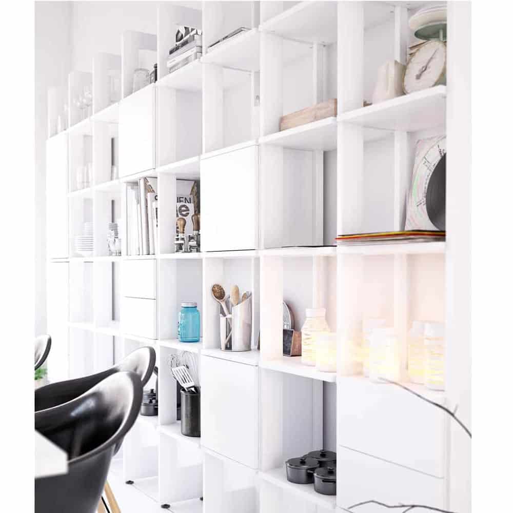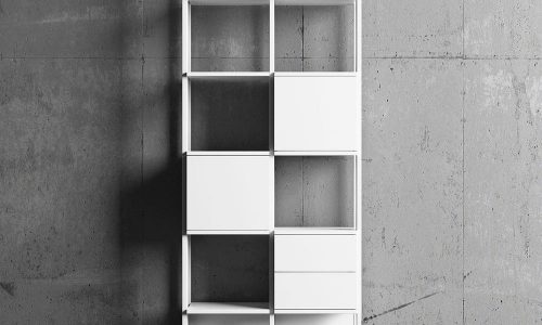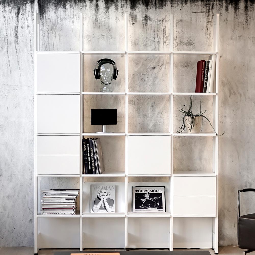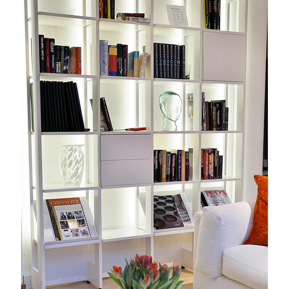 Stripe bokhylla smälter in i rummet tack vare sin luftiga konstruktion och smäckra djup på endast 29 cm. Under dagens ljusa timmar silas solljuset vackert genom hyllplanen. Och när mörkret faller skapar den infällda belysningen en unik atmosfär. Lådhurts, skåp och tidskriftshyllor kan placeras på valfri plats i de öppna facken och bokhyllan är enkel att bygga på eller dela upp för alla som är förtjusta i att möblera om.