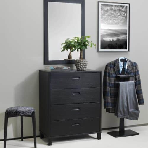 Leon byrå med fyra lådor i massiv svartbetsad ask från Oscarssons Möbel. Leon byrå med sitt djup på 40cm passar perfekt till förvaring i sovrummet. Leon byrå har också fullt utdragbara och självstängande lådor.