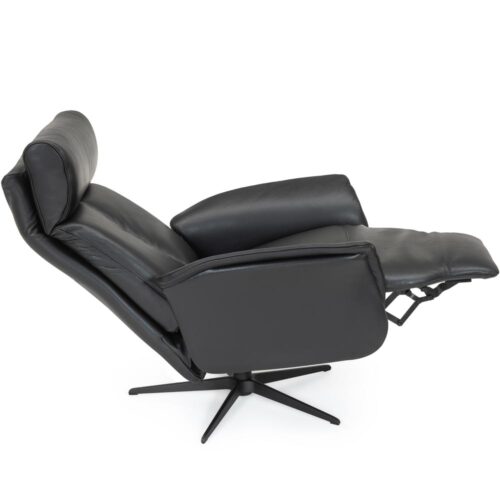 Bari reclinerfåtölj Medium i svart läder och svart metallfot från Hjort Knudsen. Bari är en mycket bekväm fåtölj med inbyggd fotpall, ställbart ryggstöd och vinkelbart nackstöd.