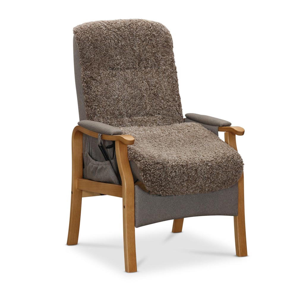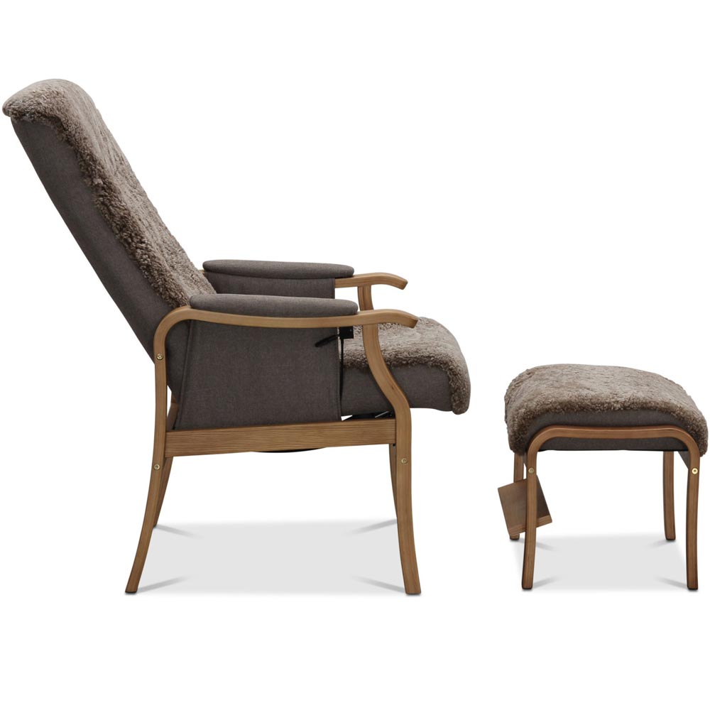 Bergen fåtölj inkl. fotpall i fårskinn Sahara/ lackad ekfanér från Hagagruppen. Bergen seniorfåtölj har bra sitthöjd och stabila armstöd att hålla i så den är lätt att komma upp från.