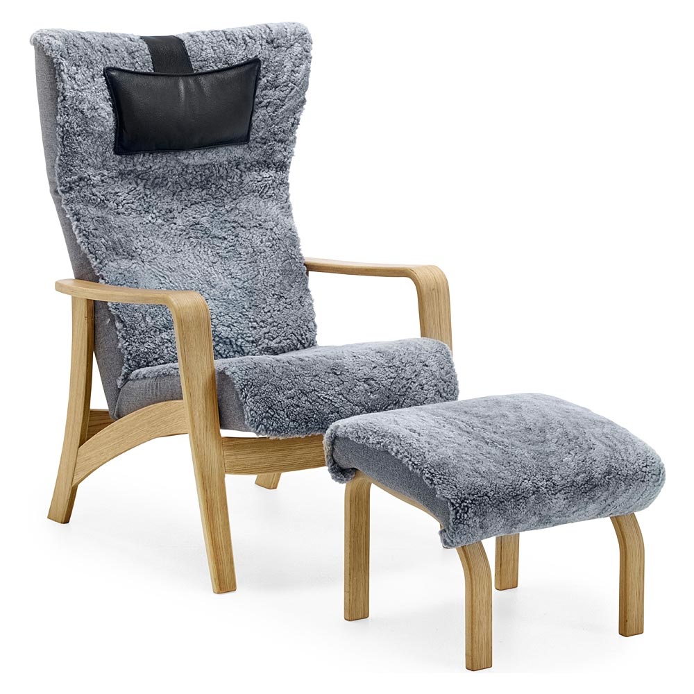 Brilliant fåtölj inkl. pall – fårskinn graphite/ ek