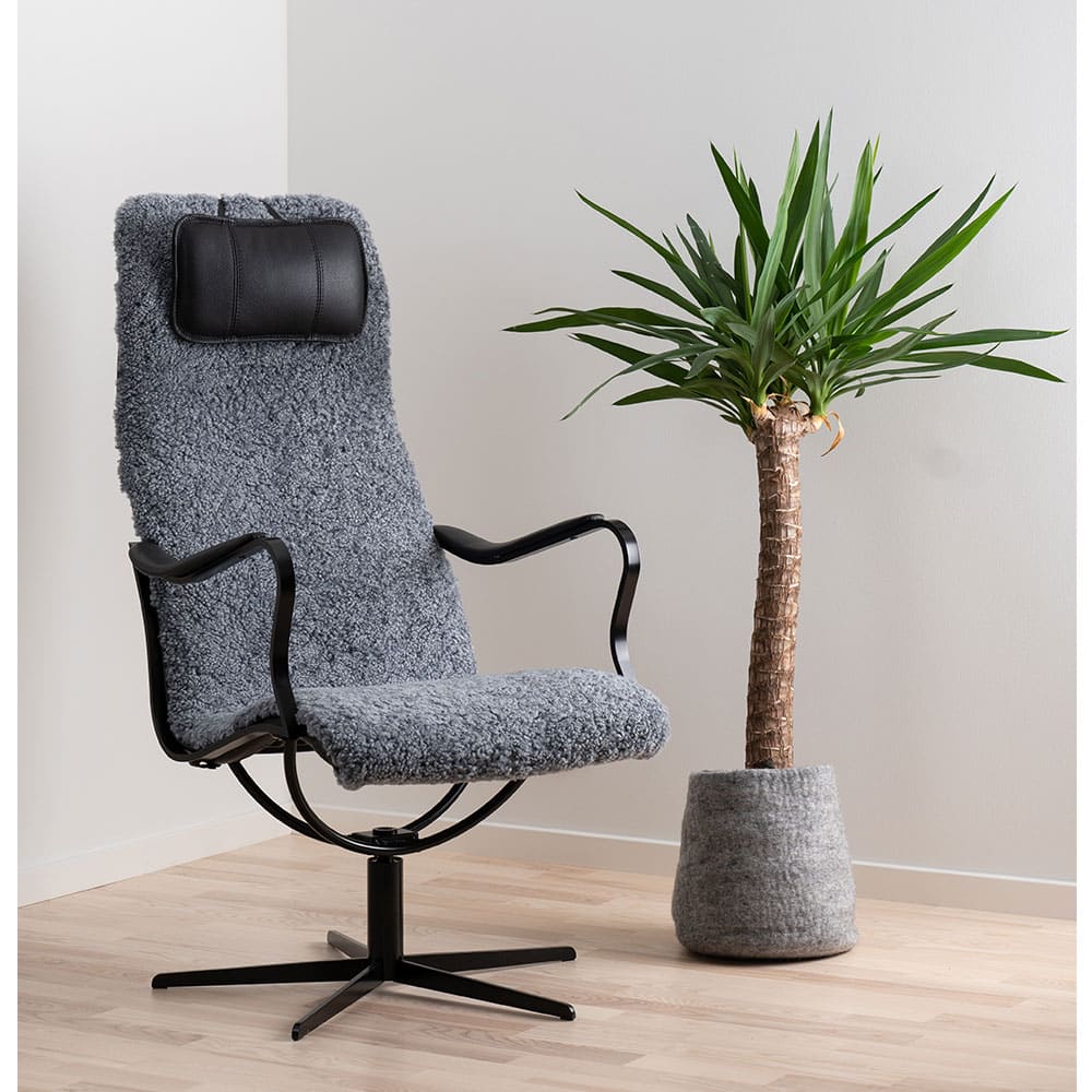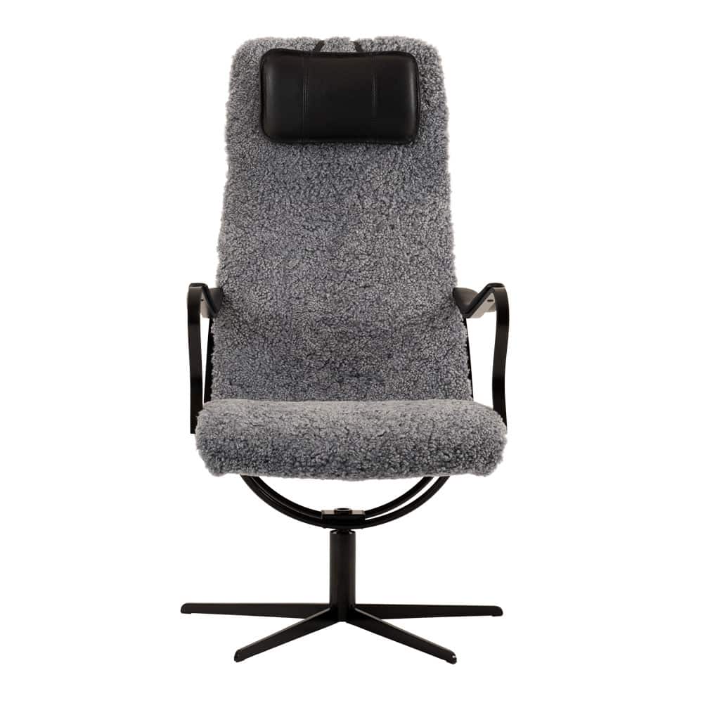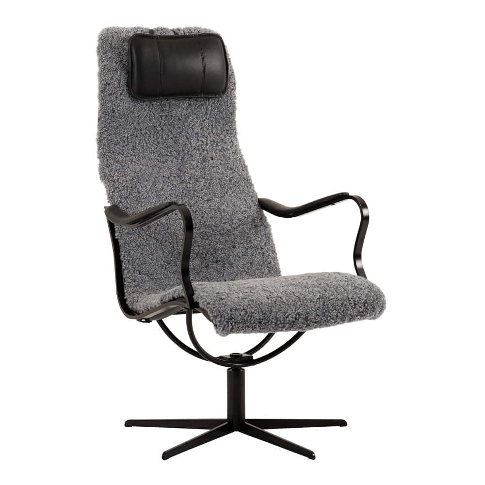 Chic fåtölj i fårskinn Skinnwille Grey från småländska Bröderna Anderssons. Underrede och armledare i svartlackad metall. Nackkudde och armstöd i läder Classic svart, rygg i tyg. Chic fåtölj har snurrfunktion och nackkudden kan enkelt höjdregleras.