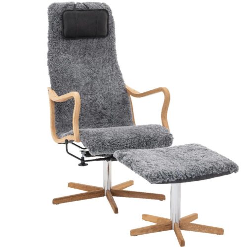 Chic fåtölj trä inkl. pall i fårskinn Skinnwille Grey från småländska Bröderna Anderssons. Underrede och armledare i oljad ek/ kromad metall. Nackkudde i läder Classic svart, rygg i tyg. Chic fåtölj har snurrfunktion och nackkudden kan enkelt höjdregleras.