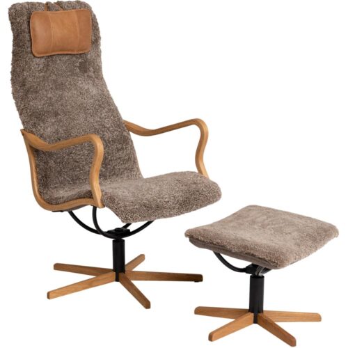 Chic fåtölj trä inkl. pall i fårskinn Skinnwille Nougat från småländska Bröderna Anderssons. Underrede och armledare i oljad ek/ metall. Nackkudde i läder Vintage cognac, rygg i tyg. Chic fåtölj har snurrfunktion och nackkudden kan enkelt höjdregleras.