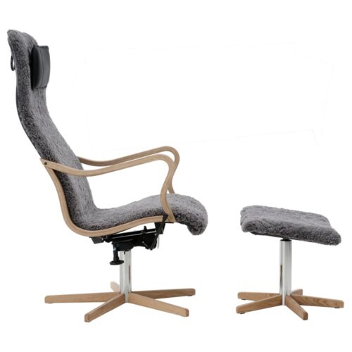 Chic fåtölj trä inkl. pall i fårskinn Skandilock Scandinavian grey från småländska Bröderna Anderssons. Underrede och armledare i oljad ek/ metall. Nackkudde i läder Grand svart, rygg i tyg. Chic fåtölj har snurrfunktion och nackkudden kan enkelt höjdregleras.