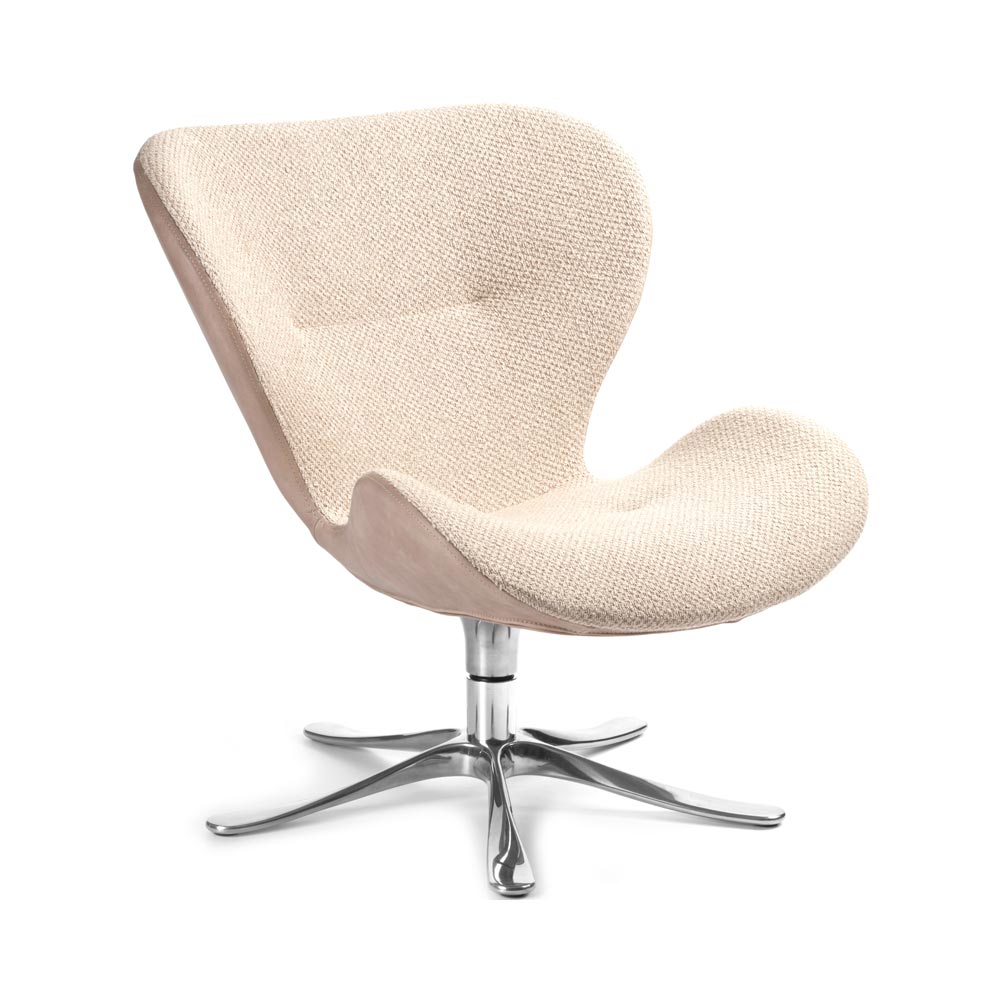 Daisy fåtölj från Småländska Conform. En skön loungefåtölj som är lika behaglig för ögat som kroppen! Här i en mix med baksida i läder Grizzly taupe och sits i tyg Etna beige. Snurrfot i formgjuten aluminium.