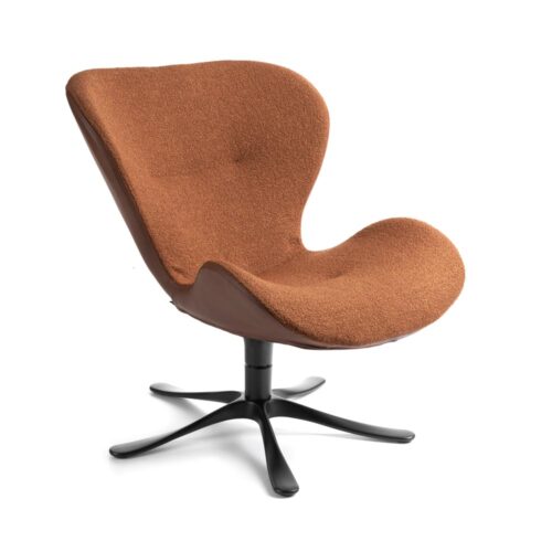 Daisy fåtölj från Småländska Conform. En skön loungefåtölj som är lika behaglig för ögat som kroppen! Här i en mix med baksida i läder Western cognac och sits i tyg Benson bronze. Snurrfot i formgjuten svartlackad aluminium.