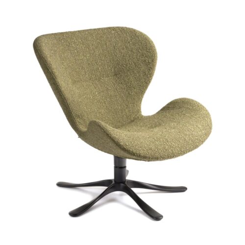 Daisy fåtölj från Småländska Conform. En skön loungefåtölj som är lika behaglig för ögat som kroppen! Klädd i tyg Denali olive och snurrfot i formgjuten svartlackad aluminium.