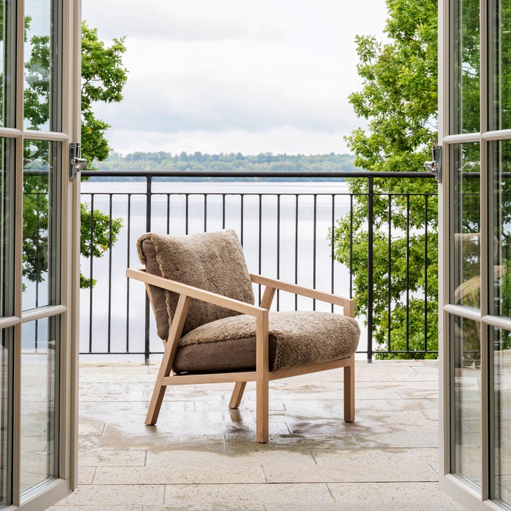 Dixie fåtölj från Småländska Bröderna Anderssons med rena nordiska former. Dixie fåtölj med massiv stomme i vitoljad ek och dynor klädda i fårskinn Nougat och tyg Facet 36 Shitake.