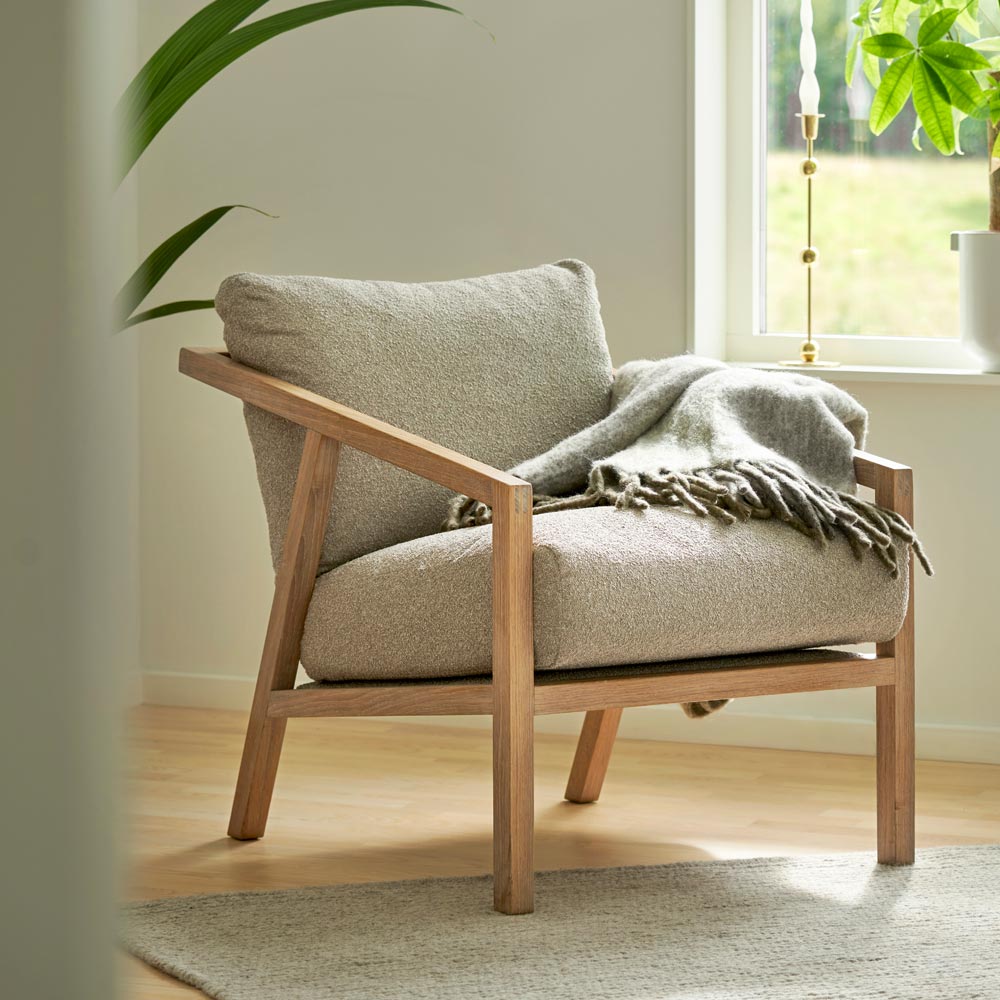Dixie fåtölj från Småländska Bröderna Anderssons med rena nordiska former. Dixie fåtölj med massiv stomme i vitoljad ek och dynor klädda i tyg Rocco 16 beige.