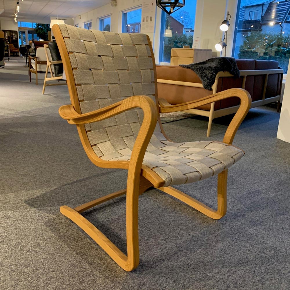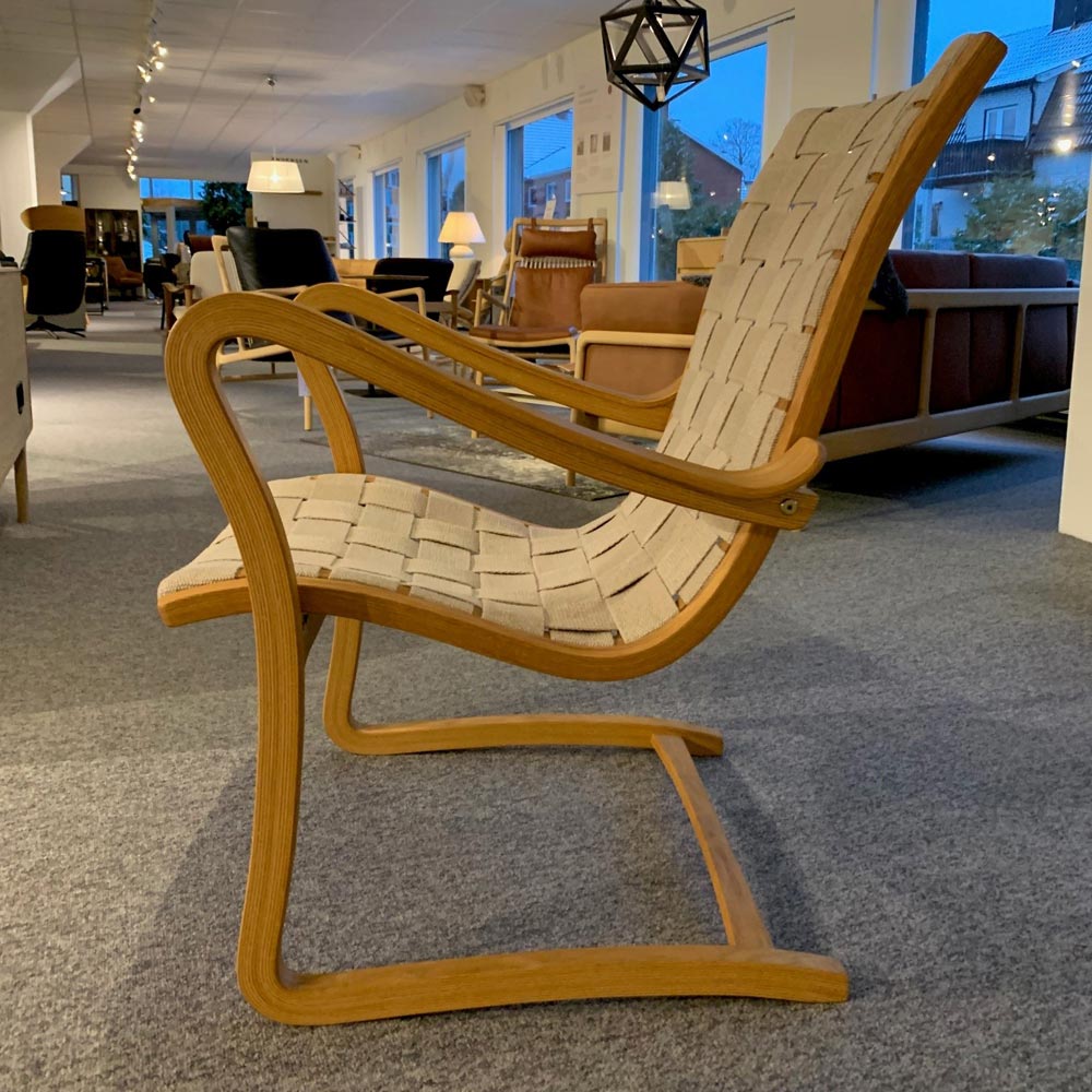 Drängen fåtölj i naturfärgad sadelgjord/ oljad ek från småländska Bröderna Anderssons. Drängen fåtölj är designad av Gustav Axel Berg. G A Berg är känd för sina anatomiska sittkurvor och sina innovativa böjträmöbler.