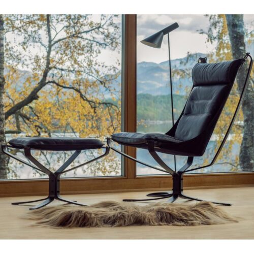 Falcon Phoenix fåtölj med hög rygg & fotpall från norska Hjelle. Läder Prescott black ink 207/ svart canvas/ kromat stålstativ.