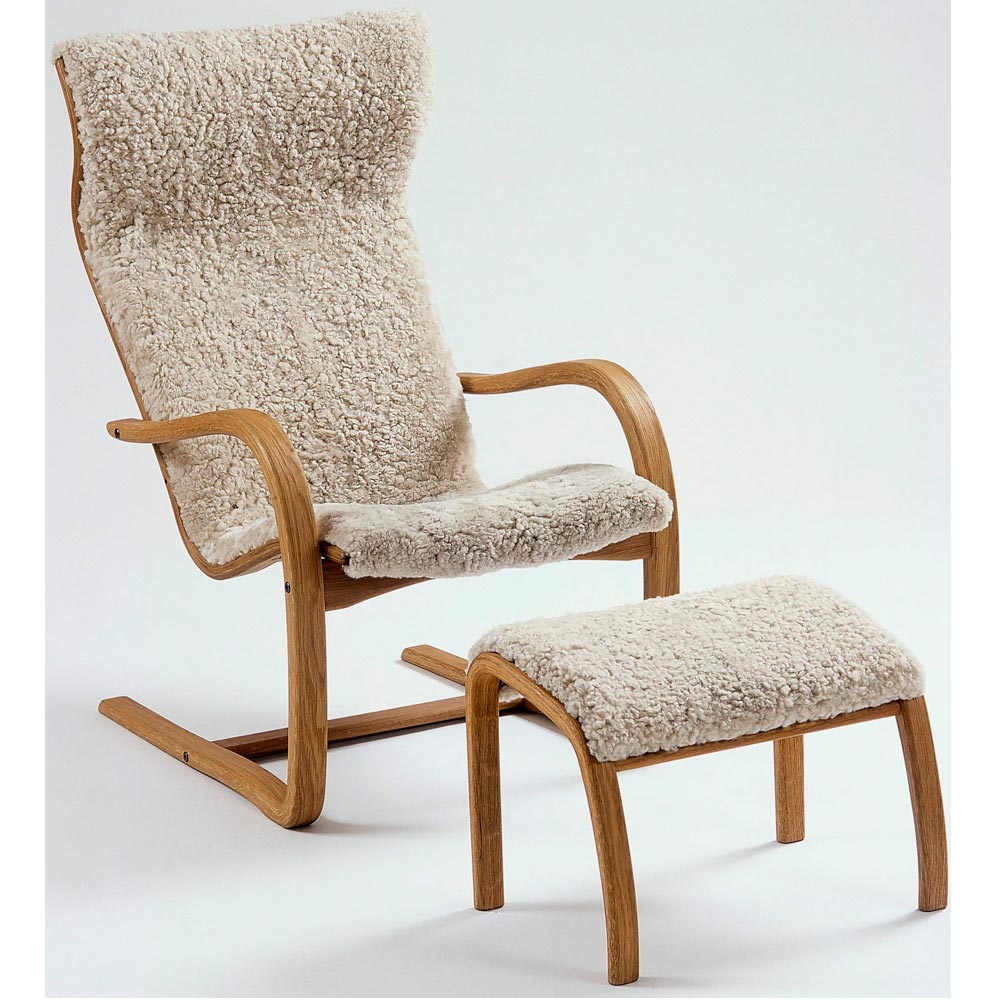 Gazell fåtölj svikt & pall – fårskinn sand/ ek