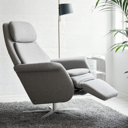 Stressless Sam reclinerfåtölj i tyg Calido light grey från norska Ekornes. Underrede Sirius i borstad aluminium.