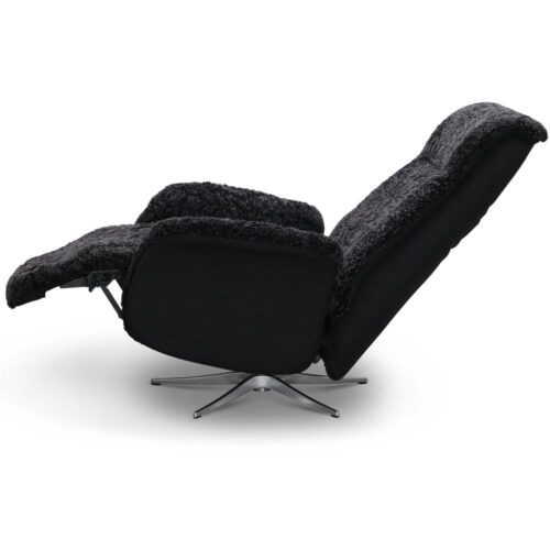 Tofta fåtölj i fårskinn Mörkgrå/ snurrfot i metall från Hagagruppen. Manuell funktion med inbyggt fotstöd ”flip-up” och ställbart ryggstöd.