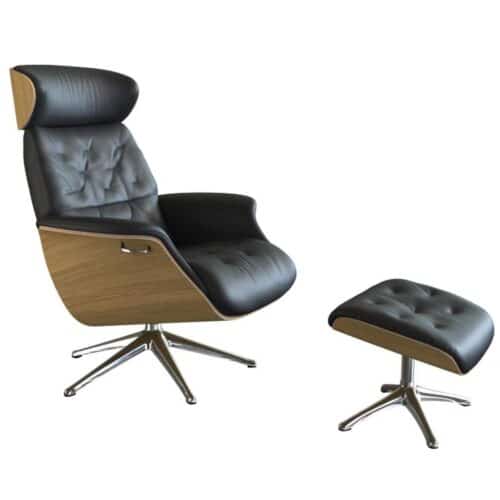Volden fåtölj medium och fotpall från danska Flexlux med en fantastisk komfort. Läder Savoy platin black 0960, utsida armstöd + nackstöd med ekfanér och benställning i kromad metall. Ställbart ryggstöd, nackstöd som är höj- och sänkbart samt även vinkelbart. Snurrfunktion på fåtöljen.