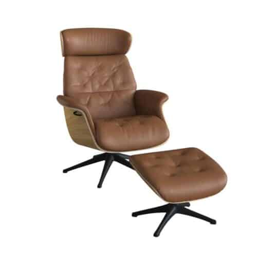 Volden fåtölj medium och fotpall från danska Flexlux med en fantastisk komfort. Läder Savoy cognac brown 0964, utsida armstöd + nackstöd med oljad ekfanér och benställning i svartlackad metall. Ställbart ryggstöd, nackstöd som är höj- och sänkbart samt även vinkelbart. Snurrfunktion på fåtöljen.