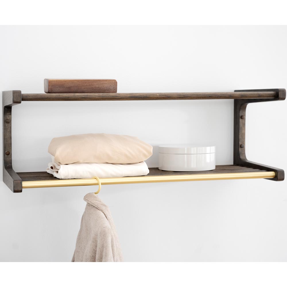 Inverness hatthylla 80 i brunbetsad ek/ mässingsfärgad metall från Rowico. Inverness har ett klassiskt utryck inspirerad av Orientexpressens tågkupeér.