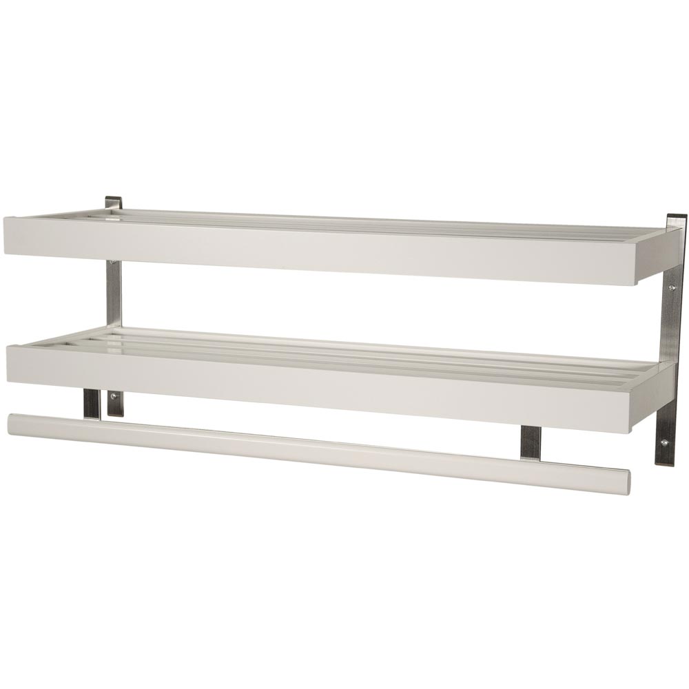 Nadja hatthylla 2 plan 80cm i vitlack/ slipat stål. Exklusiv design tillverkad av småländska Oscarssons Möbel.