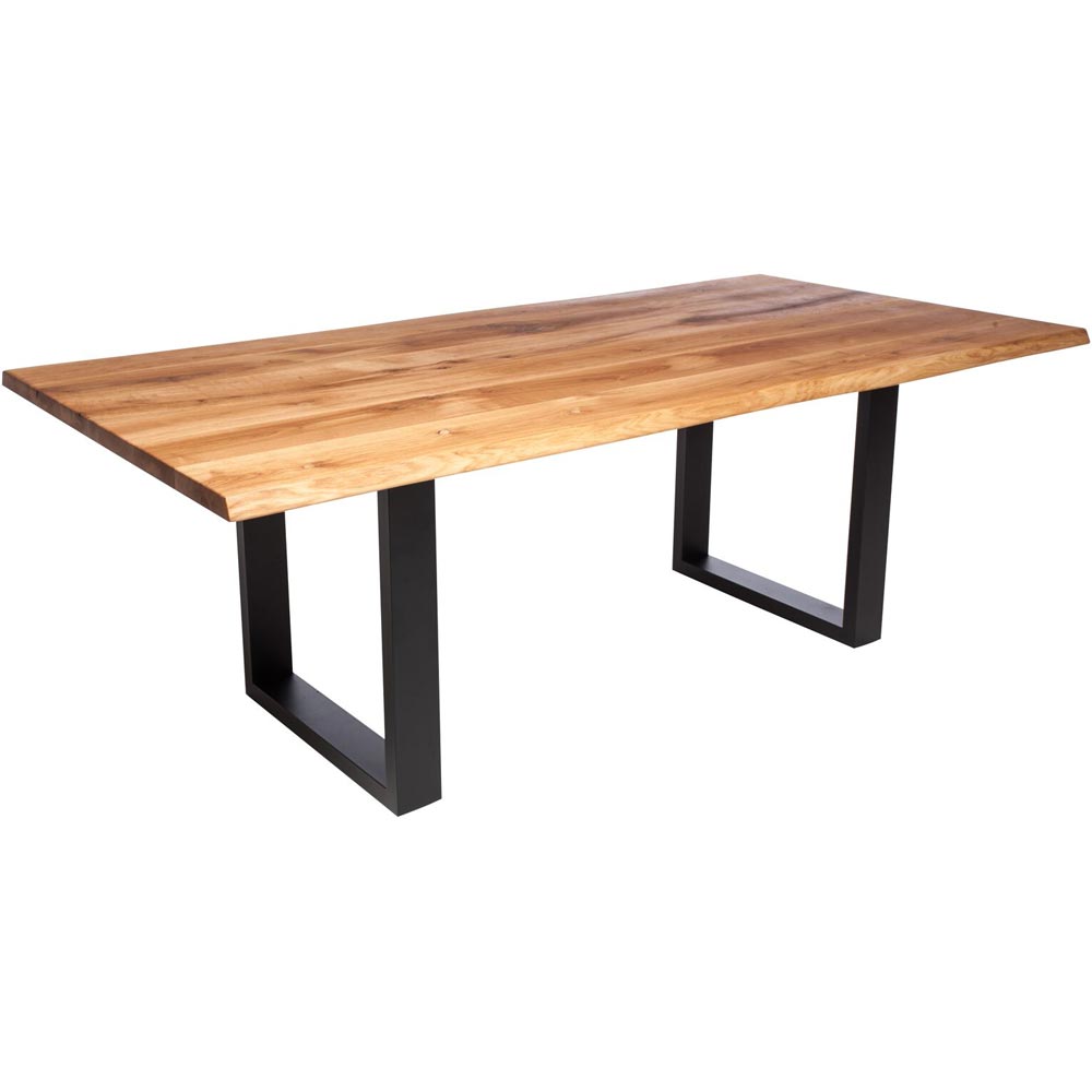 Fargo matbord med hela plank i en läcker design i blandning mellan rustikt och modernt. Fargo matbord är bordet med möjligheter! Bordet visas i massiv oljad ek med svarta fillers i kvistarna. Hel bordsskiva med naturkant. Metallben A2 svartlackerat 4*10cm