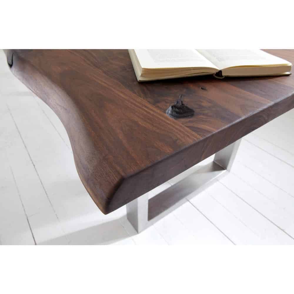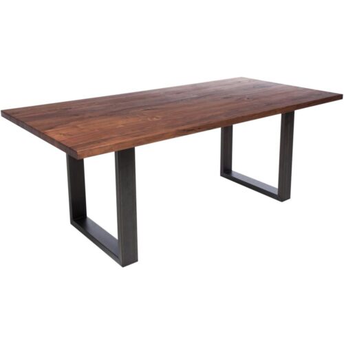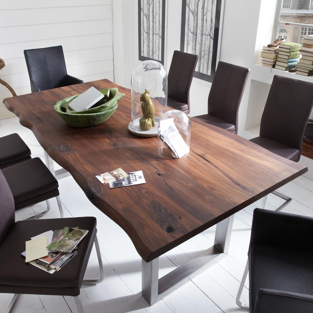 Fargo matbord med hela plank i en läcker design i blandning mellan rustikt och modernt. Fargo matbord är bordet med möjligheter! Bordet visas i massiv oljad valnöt med svarta fillers i kvistarna. Hel bordsskiva med rak kant. Metallben A3 industristål lackerat 4*10cm