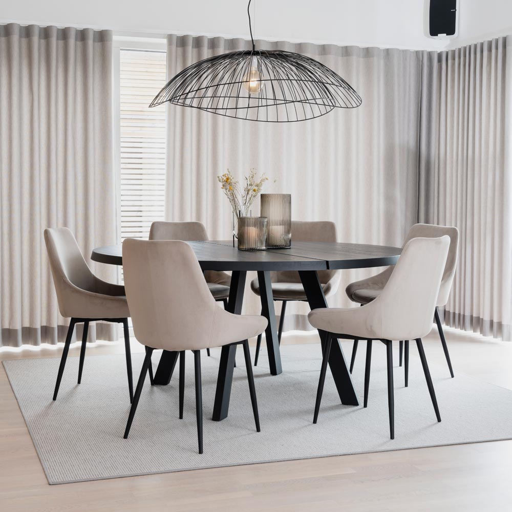 Fred runt matbord i massiv svart ask mattlack från Rowico. Bordsskivan har en snygg delning i mitten. Ben i svartlackad metall.