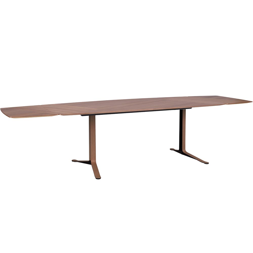 Fusion matbord i oljad valnöt från danska PBJ. Design av Morten Svendsen. Läckra ben med bladtunn design med metall i mitten och fanér ytterst. En fin båtformad bordsskiva med fasad kant ger Fusion matbord ett mycket lätt intryck.