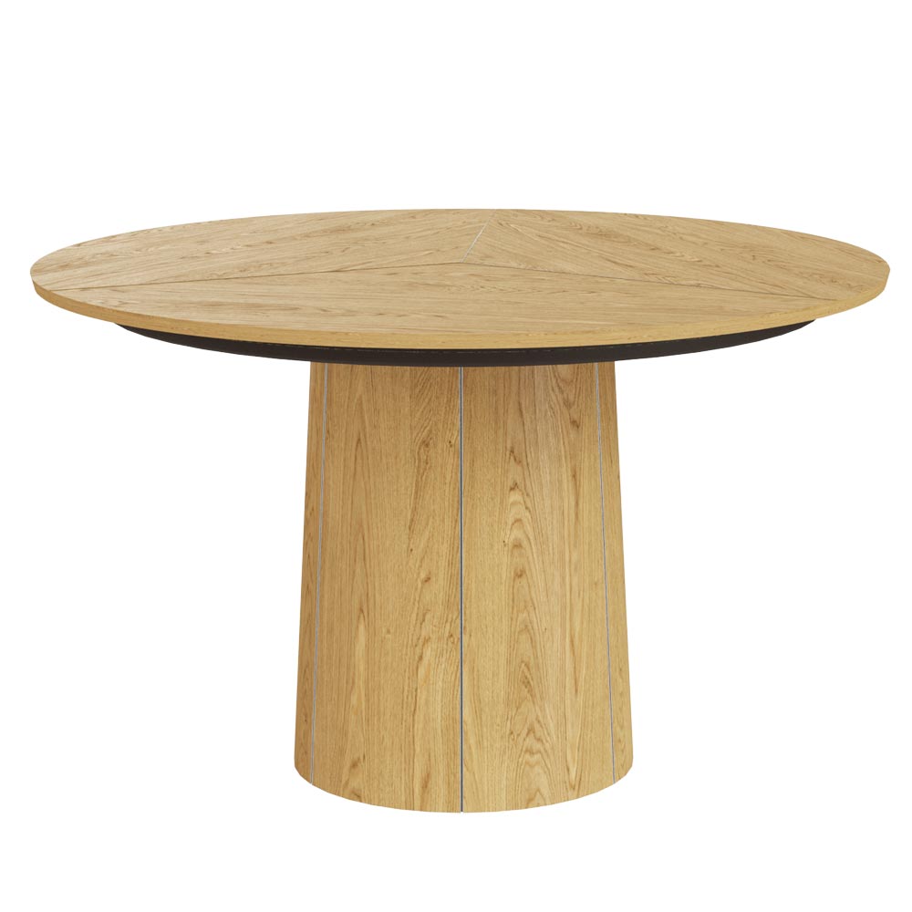 SM33 runt matbord har en mycket smart lösning, där man drar ett handtag under bordsskivan i sidled. Skivan delar sig då i 3 skivor och det blir ett hålrum i mitten av bordet. 3 smala skivor trycks upp ur hålrummet i mitten med hjälp av en fjäderlösning. Bordets storlek ökar då i diameter från 123 – 149cm. Fantastiskt smidigt och smart! Välj mellan olika träslag, massivt eller fanér samt även med bordsskivan i laminat!