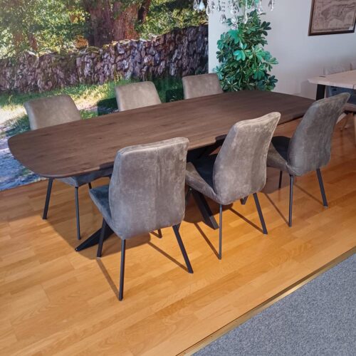 Essen matbord i massiv brunlackad ek tillsammans med Bremen snurrstol från danska Hjort Knudsen. Essen matbord har en oval form på bordsskivan och ett snyggt och praktiskt underrede i svart metall. Bremen snurrstol är en mycket skön stol som har snurrunderrede i svartlackad metall och justerbar rygg vilket ger dig möjligheten att luta dig tillbaka. Bremen stol är här klädd i tyg Tex-bull forest.