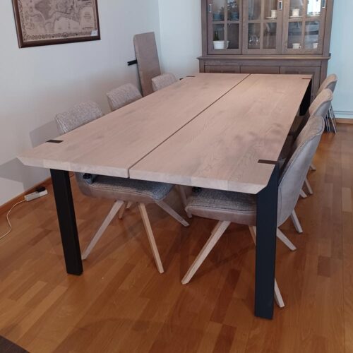 Köln matbord i massiv vitoljad ek och Hannover snurrstol från danska Hjort Knudsen. Köln matbord har en diagonal delning i mitten av skivan och svarta metallben som sticker upp genom bordsskivan. Hannover stol med sin sköna sittkomfort och snurrunderrede i vitoljad ek. Här klädd i tyg Chronotex clay och baksida i tyg Kentucky beige.