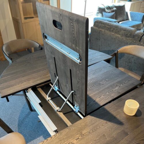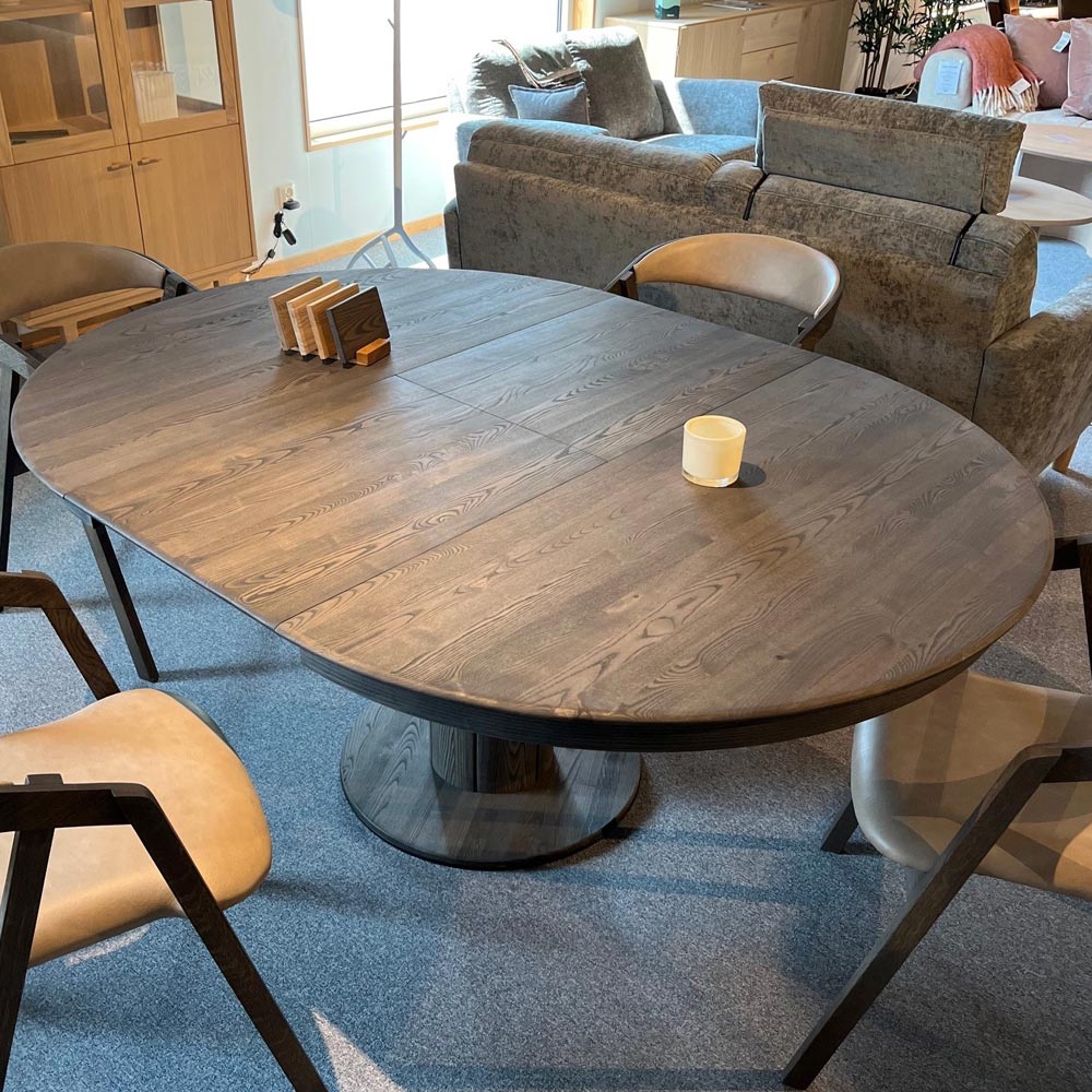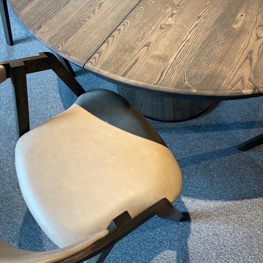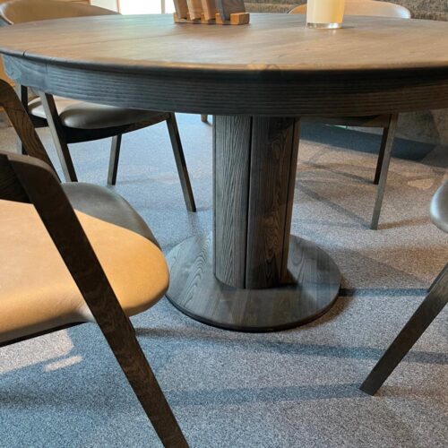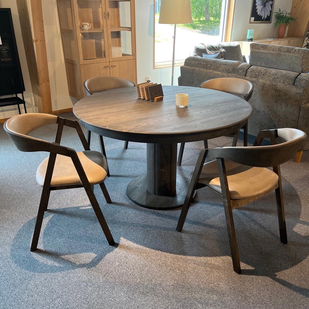 Orlando runt matbord 130cm + 1st ilägg i massiv ask charocoal tillsammans med Elly karmstol i ek charcoal/ läder Antigo taupe.