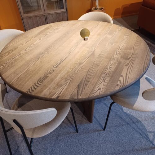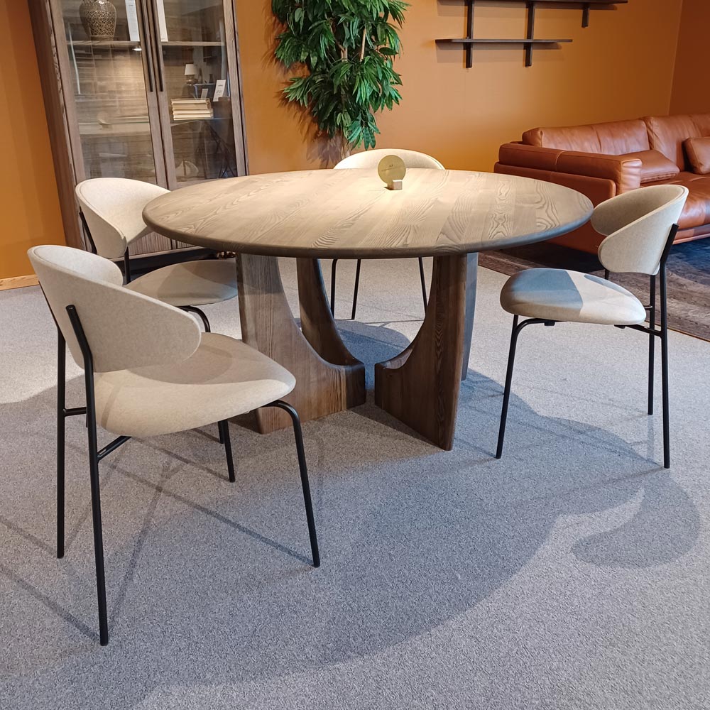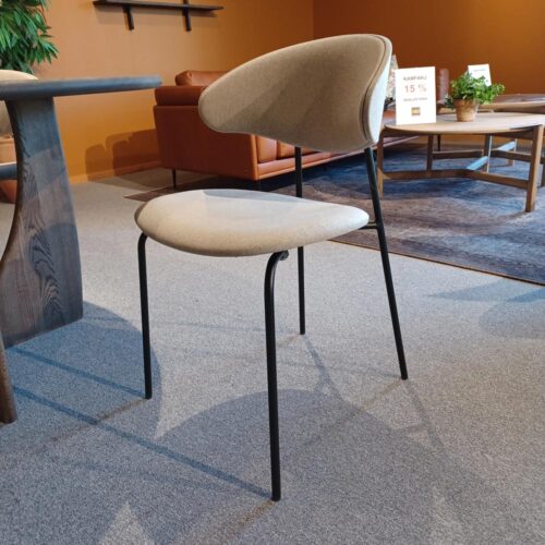 Longboat runt matbord i massiv oljad ask Dark grey C11/ kantprofil 8 helrundad tillsammans med Ram Steel stol i svart metall och tyg Wooly beige. En snygg matgrupp från danska Kristensen & Kristensen.