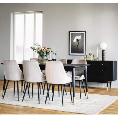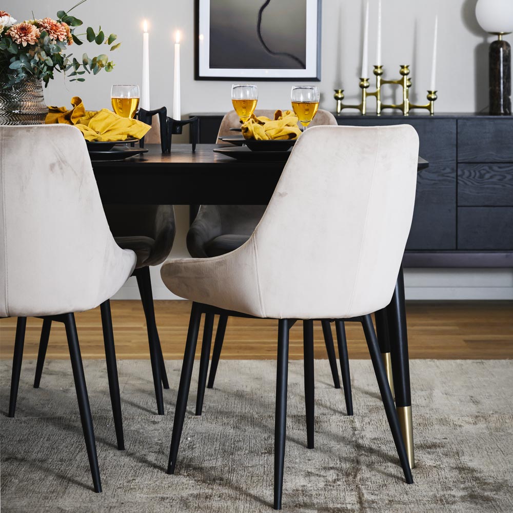 Sierra stol i beige sammet/ svarta metallben tillsammans med Fenwood matbord i svartbets från Rowico. En läcker matgrupp som ger ett ombonat och lyxigt intryck. Fenwood matbord har en mässingshylsa längst ner på bordsbenet som ger den där lilla extra känslan!
