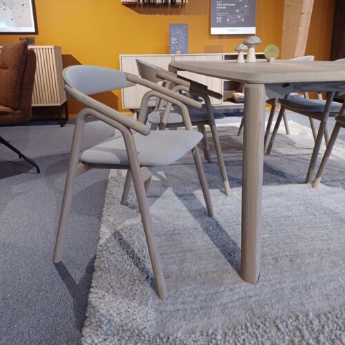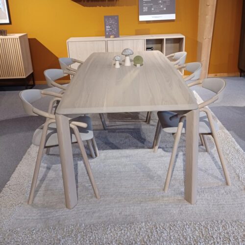 Driplet matbord tillsammans med Veifa stol i massiv oljad ask varmvit C16 från danska Kristensen & Kristensen. Veifa stol är klädd i ett snyggt beige tyg och har ett vackert formspråk med en omfamnande design och bekväm sittkomfort. En snygg matgrupp i modern design!