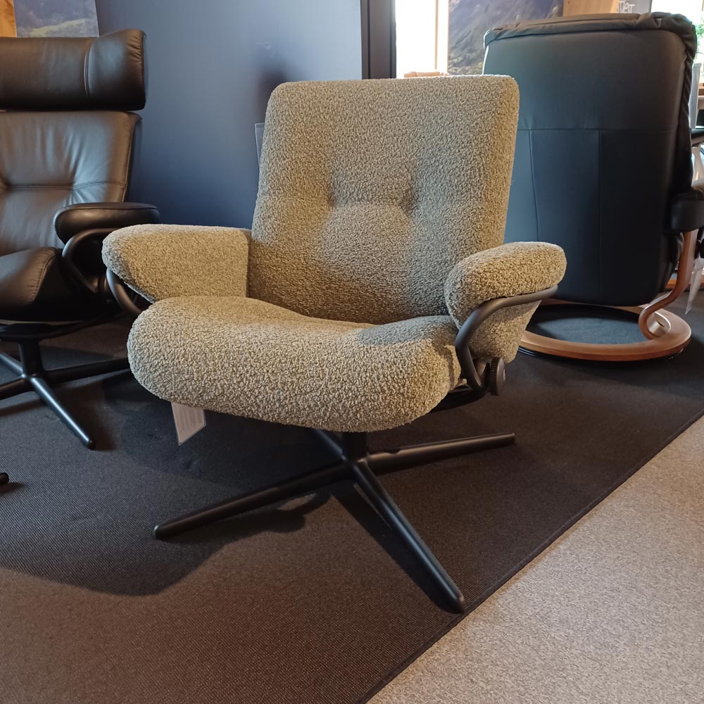 Berlin fåtölj med låg rygg från norska Stressless Ekornes. Tyg Orchid 90 green och Cross underrede i mattsvart.
