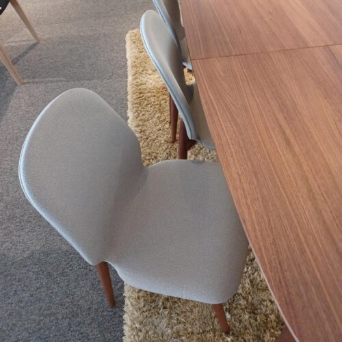 Bow matbord i oljad valnöt fanér + 6 stycken Tradition stolar från danska PBJ. Bow matbord har en iläggsskiva på 96cm i intarsia vilket blir en snygg detalj på bordet. Tradition stolarna är klädda i tyg Cura 80 light grey och ben i massiv valnöt.