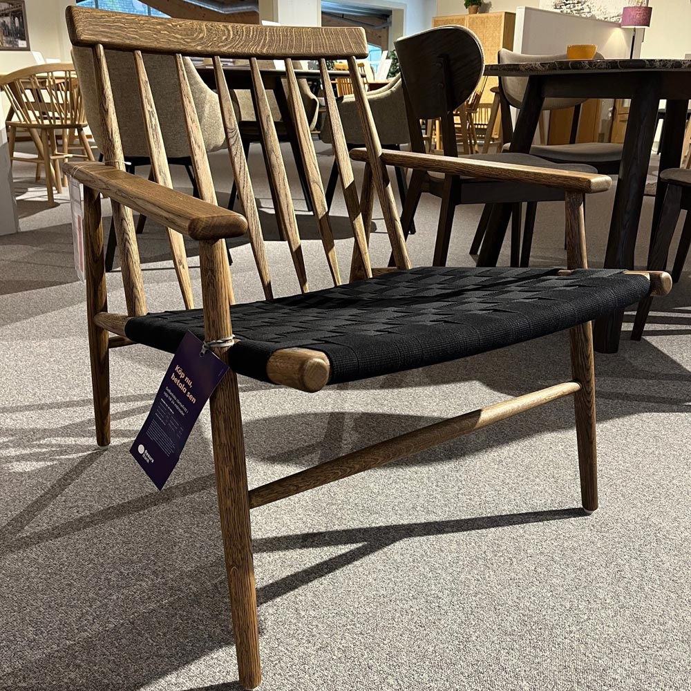Canwood loungestol i brunoljad ek/ sits i svart flätad sadelgjord (bomullsband) från Rowico.