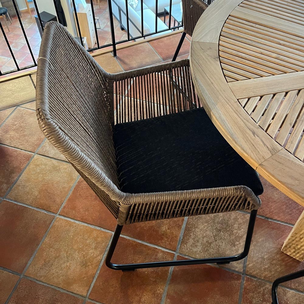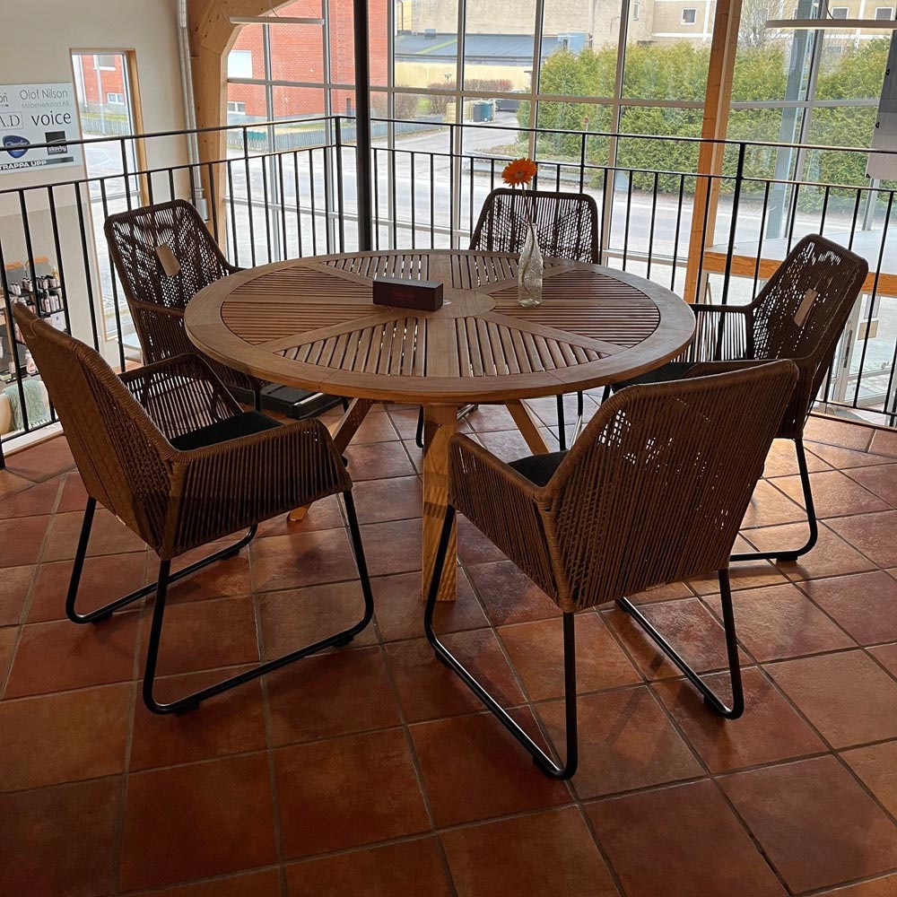 1st Circus runt matbord 150cm i massiv teak + 5st Midway karmstolar i twistad brun konstrotting/ svart metallben/ mörkgrå dyna.