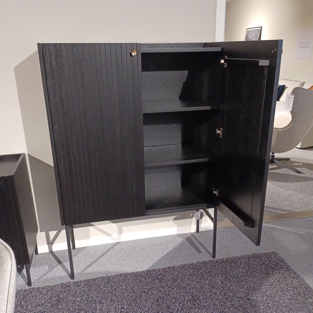 Halifax skåp i svartbetsad ek från Rowico. Ett stilrent skåp med massiva stående ribbor på dörrarna. Svartlackade metallben. Soft-close stängning i dörrarna.